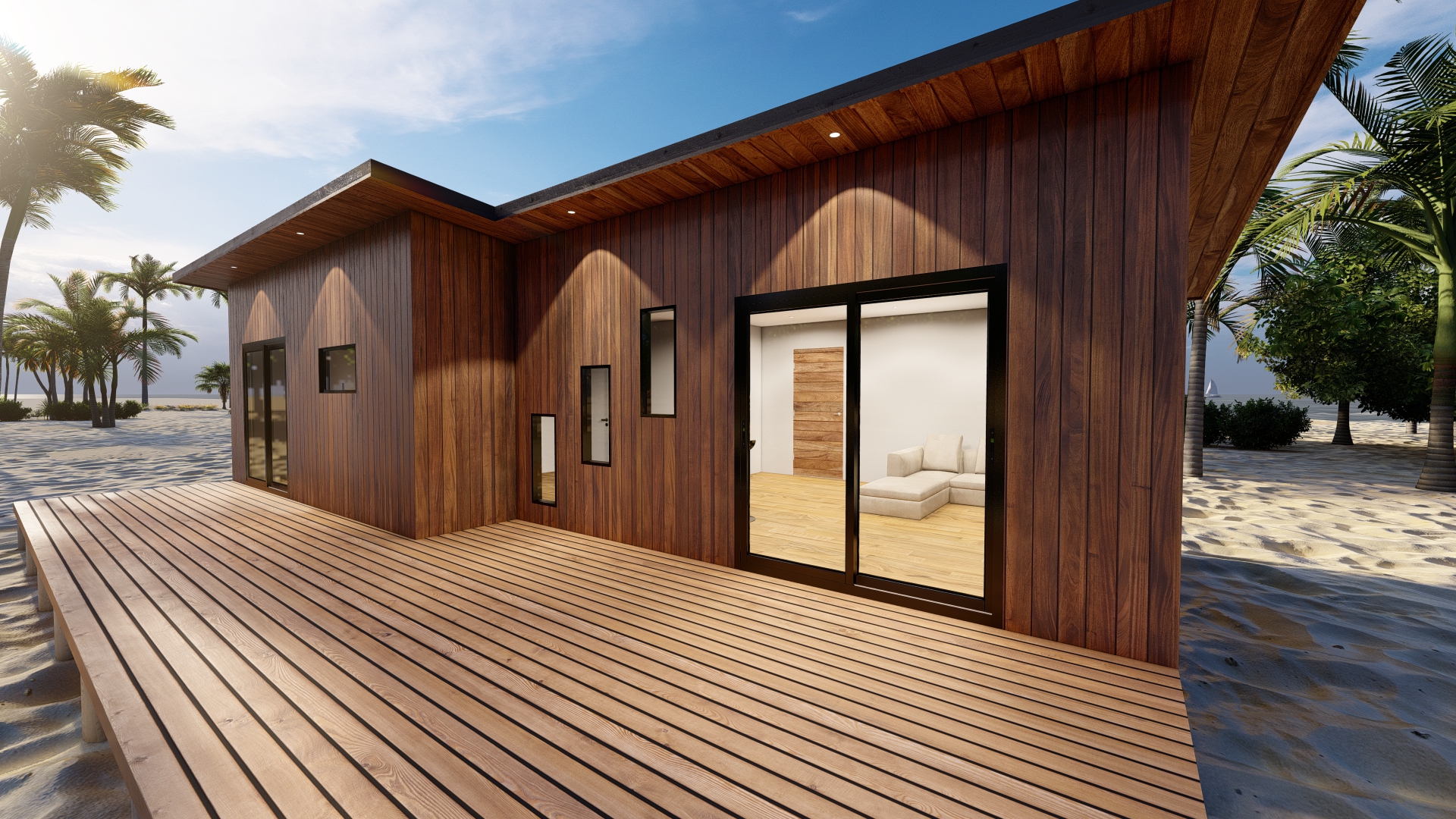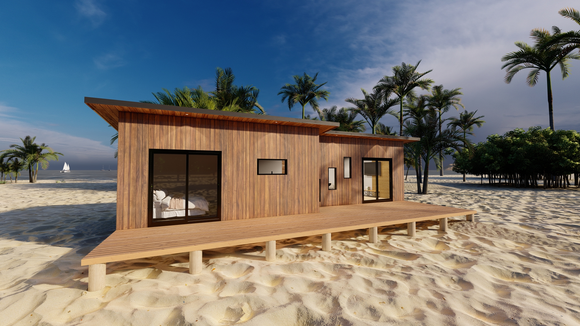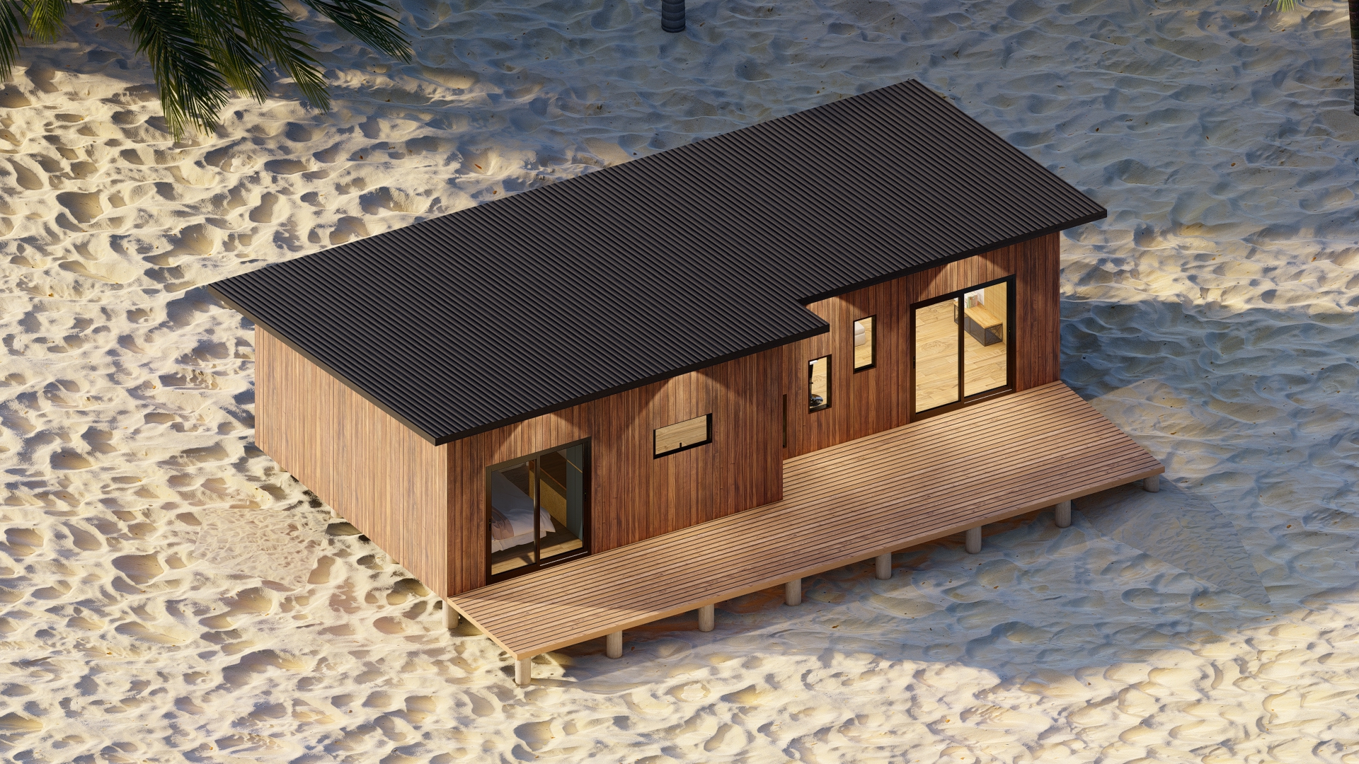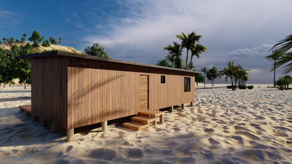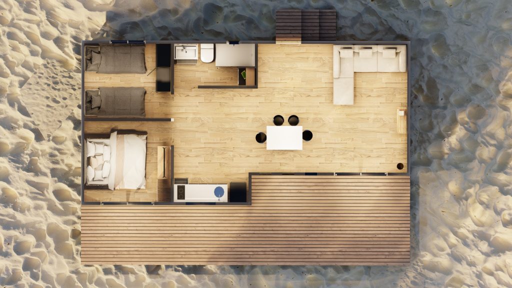 Además, nuestra casa prefabricada de 55,5 metros cuadrados cuenta con un techo inclinado diseñado no solo por estética, sino también por funcionalidad. Esta característica asegura un eficiente flujo de la lluvia, protegiendo la estructura y prolongando la vida útil de la vivienda, al mismo tiempo que aporta un toque distintivo al diseño exterior.