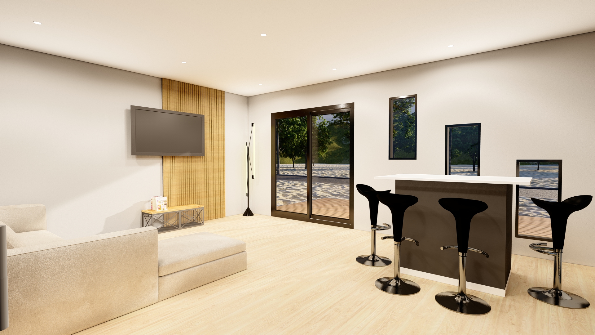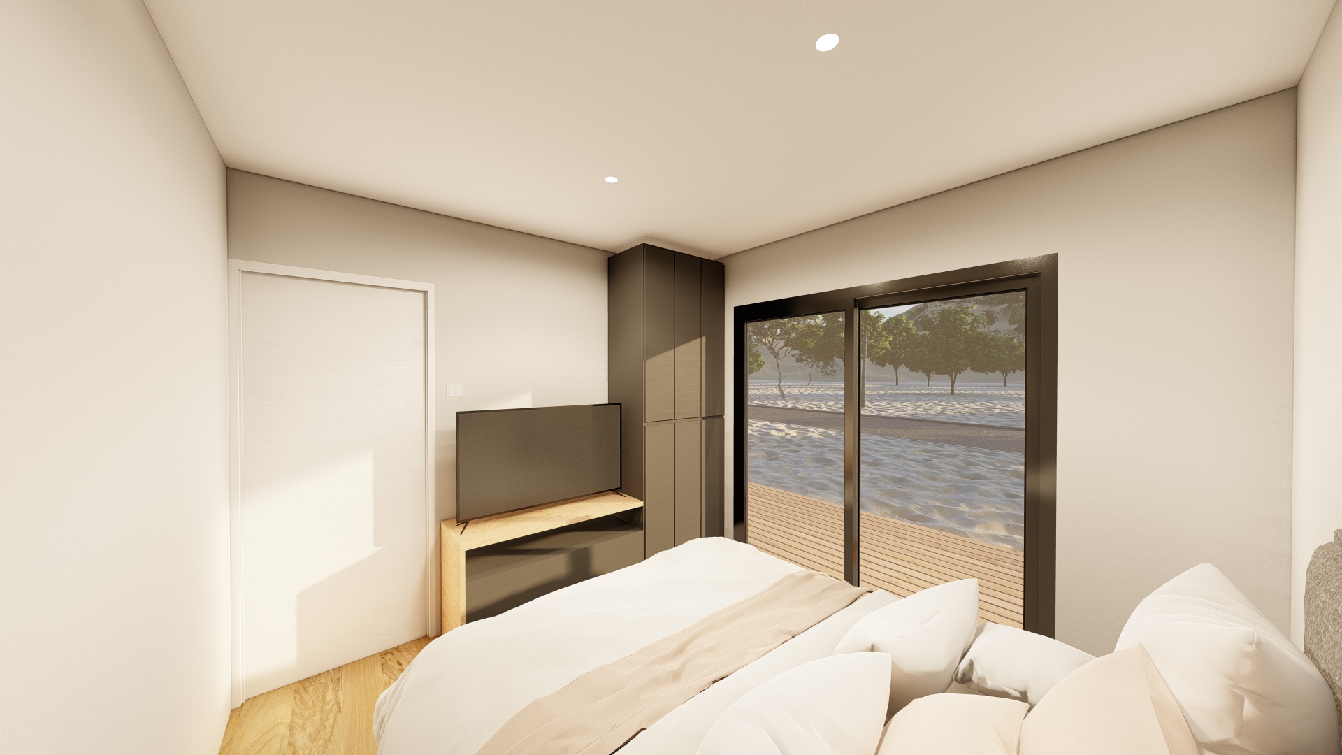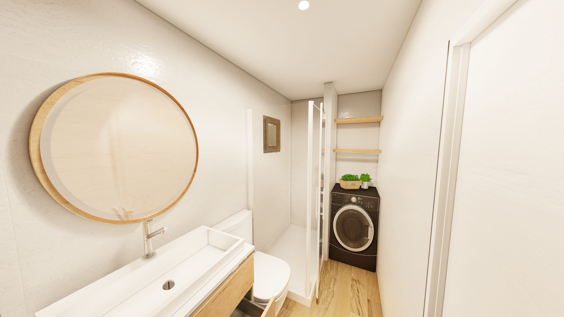 Además, nuestra casa prefabricada de 55,5 metros cuadrados cuenta con un techo inclinado diseñado no solo por estética, sino también por funcionalidad. Esta característica asegura un eficiente flujo de la lluvia, protegiendo la estructura y prolongando la vida útil de la vivienda, al mismo tiempo que aporta un toque distintivo al diseño exterior.